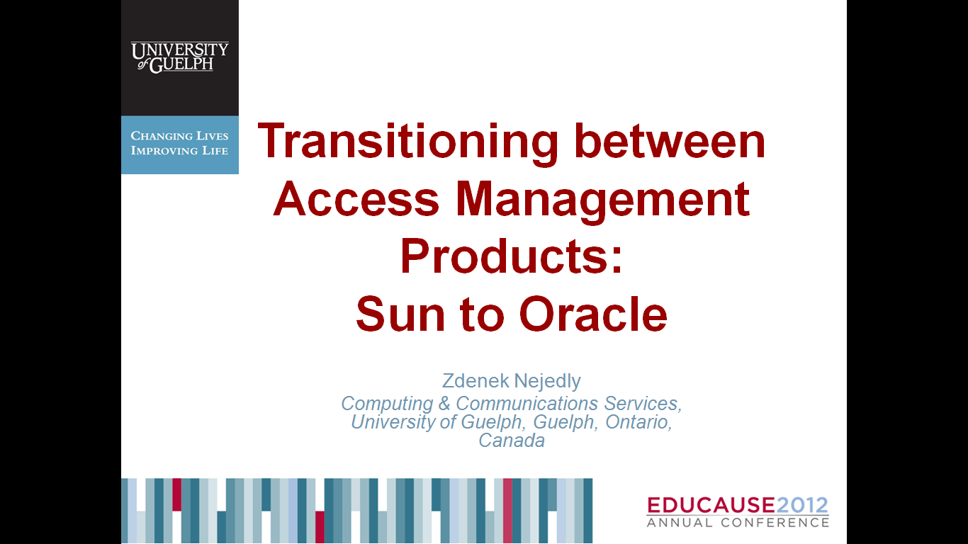The University of Guelph converted its key systems from Sun Access Manager to Oracle Access Manager and is now finalizing the transition. While OAM is a commercial product, we will discuss a number of custom solutions we added to expand functionality, to minimize the impact of the transition between two distinct products, and to lower costs.