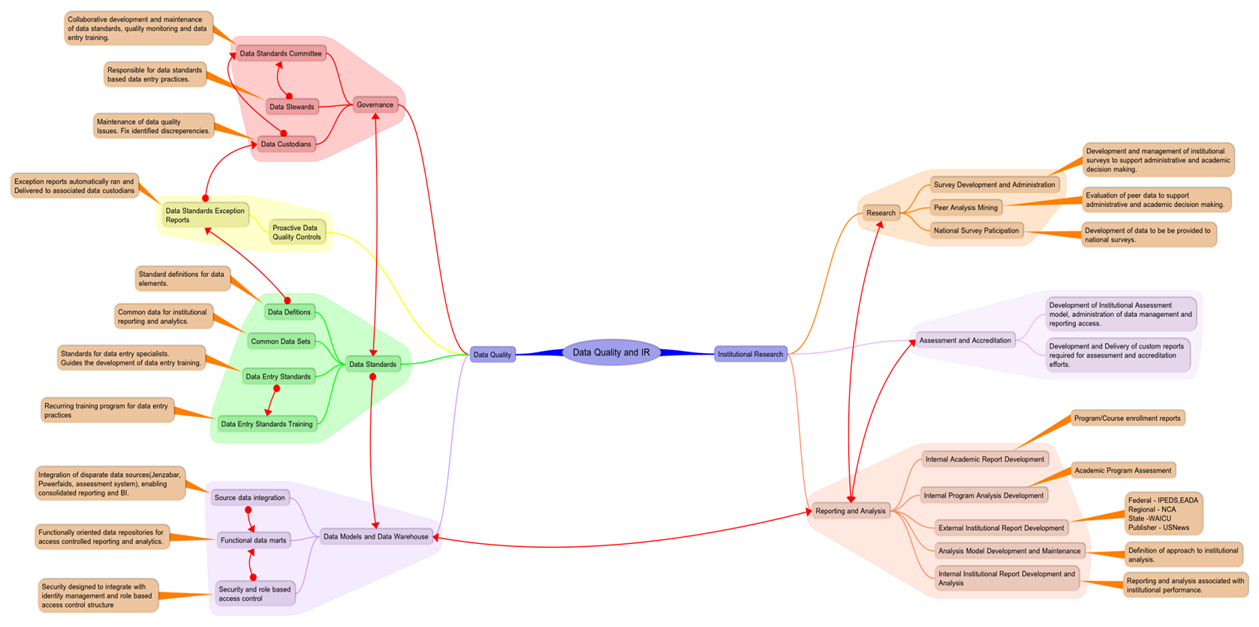 We also took the opportunity to expand the role of Institutional Research beyond traditional compliance data collection and reporting. The new model also includes responsibilities for assessment and data quality management. Attached you will find a mind map describing the model implemented at Stritch. Though we are still fairly young in our implementation of the model, we have seen significant improvement in collaboration between Data Quality & Institutional Research, Enterprise Systems, and the academy. Specifically, the DQIR team has worked collaboratively with Enterprise Systems and the Academy to successfully implement Online End of Course Evaluations, the LiveText Assessment Management System and refined data standards in academic and administrative functional areas.