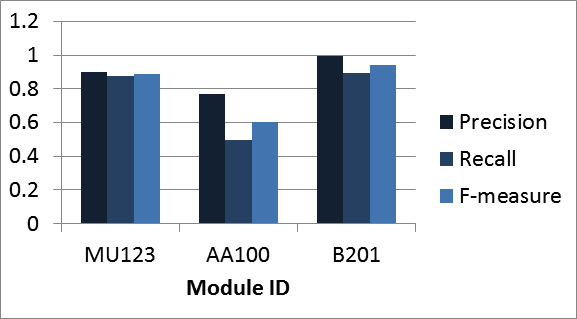 For both types of models, decision trees were found to outperform other kinds of learning algorithms. The performance drop classifier was able to achieve high precision for all three modules (between 0.77 and 0.98) and good overall accuracy (F-measure between 0.60 and 0.97 for two of them). Figure 1 shows the classification performance for three different courses when predicting the drop in a student's performance at the next tutor-marked assessment (TMA). Performance is measured as precision and recall for the target module ("performance drop expected").