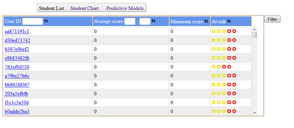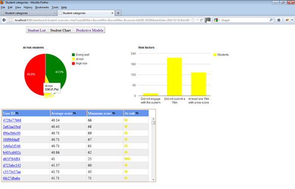 A dashboard was developed to pilot the predictive modeling with OU lecturers, in particular the performance drop classifier. They were able to log in to see the data set of their allocated students. The students were listed in a table (figure 3) that could be ordered by selection criteria such as the calculated risk category, which ranges from red (high risk) through amber (medium risk) to green (no risk), which isn't shown in the table as the students are being ordered from highest risk to lowest. In figure 3, each colored dot in the "at risk" column indicates a different type of risk. The dot on the right-hand side is the output of the predictive model for performance drop. In this case, the "final outcome" model was selected. (An admin screen allows some configuration in terms of selecting a model to build and a data set to run it on.) So "red" students, on the basis of their VLE activity to the date given, are predicted to fail the module.