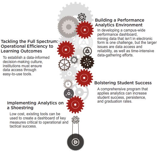 Interactive Graphic: Click on the red gears below to access case studies from institutions that have successfully implemented analytics (Adobe Flash Player required).