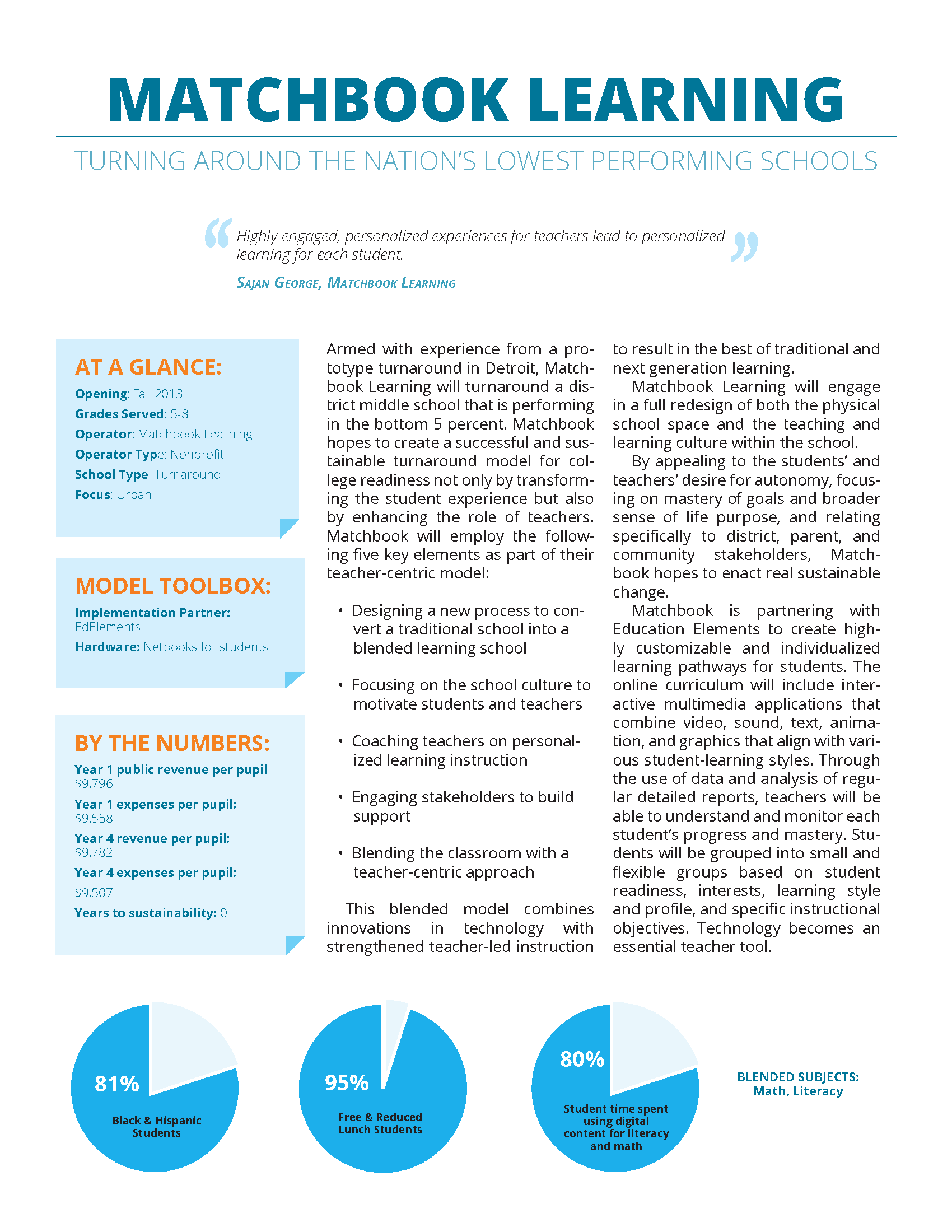 This middle school model operated by Matchbook Learning Solutions puts teachers at the center . Matchbook believes that teacher quality, when combined with innovations in technology and a focu…